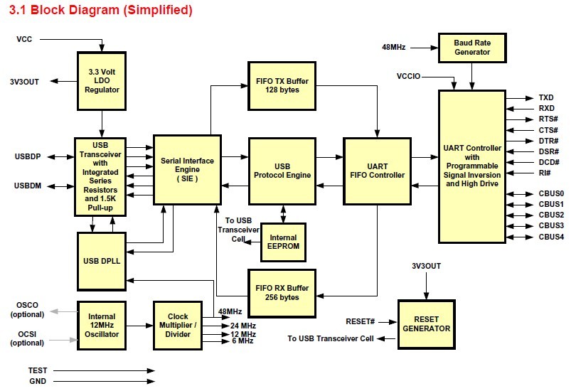 FT232RL features: (1)Device supplied preprogrammed with unique USB serial number; (2)Support for USB suspend and resume; (3)Support for bus powered, self powered, and high-power bus powered USB configurations; (4)Integrated 3.3V level converter for USB I/O; (5)Integrated level converter on UART and CBUS for interfacing to 5V to 1.8V Logic; (6)True 5V / 3.3V / 2.8V / 1.8V CMOS drive output and TTL input; (7)High I/O pin output drive option; (8)Integrated USB resistors; (9)Integrated power-on-reset circuit; (10)Fully integrated clock - no external crystal, oscillator, or resonator required.