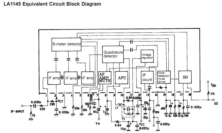 LA1145 features: (1)On-chip IF count buffer circuit and microprocessor-controlled switch circuit for ETR; (2)Compared to the LA1140, the LA1145, 1145M offer: Improved signal meter output linearity; Improved band mute temperature stability; Improved S/N ratio; Improved sound quality at weak signal input when noise is present, and Improved AMR characteristics during weak signal input; (3)Reduced parts’ count simplifies design: On-chip IF count buffer circuit; On-chip SD circuit — sensitivity can be set independently of soft mute characteristics, and; Variable S-meter gradient — three pin S-meter output (pins 5, 16 and 17) facilitates independent control of SNC and HCC.